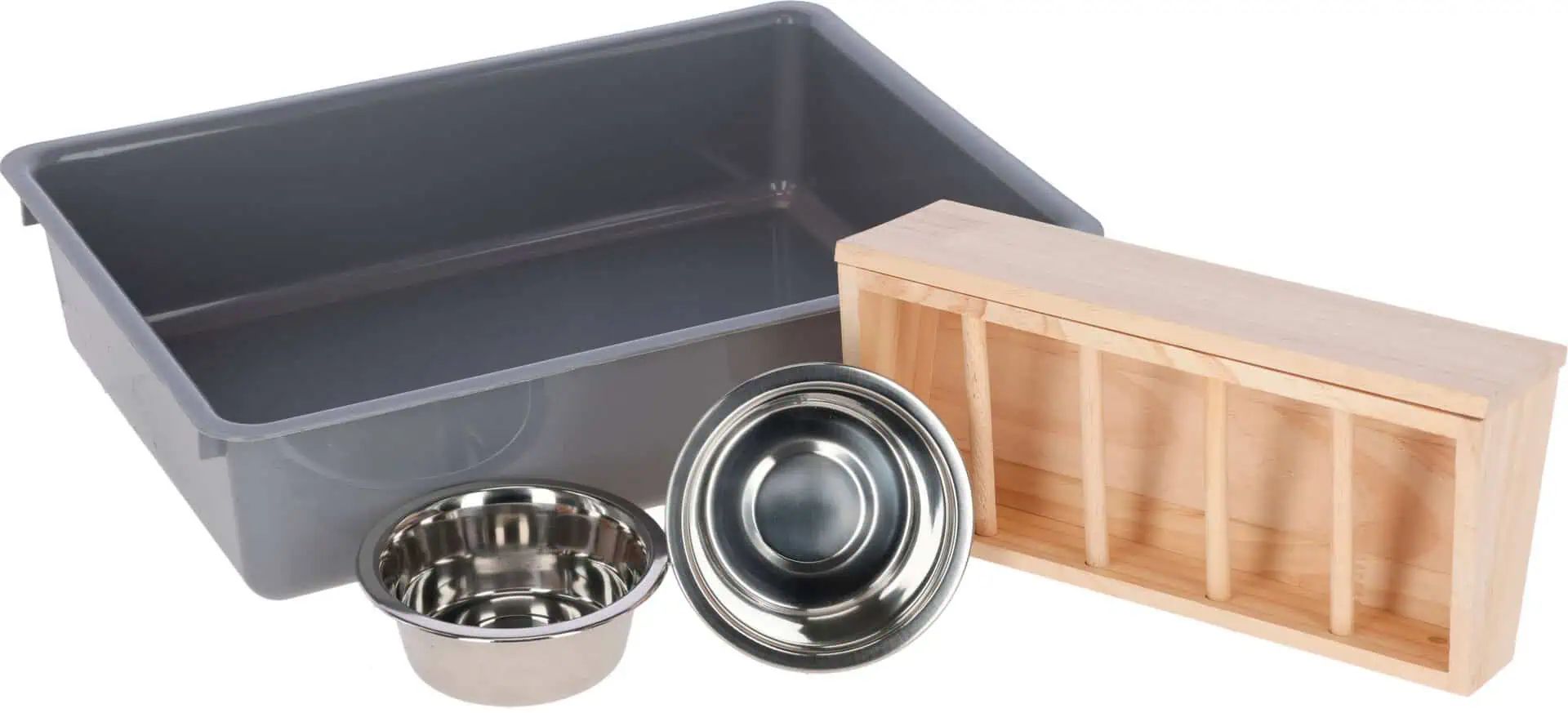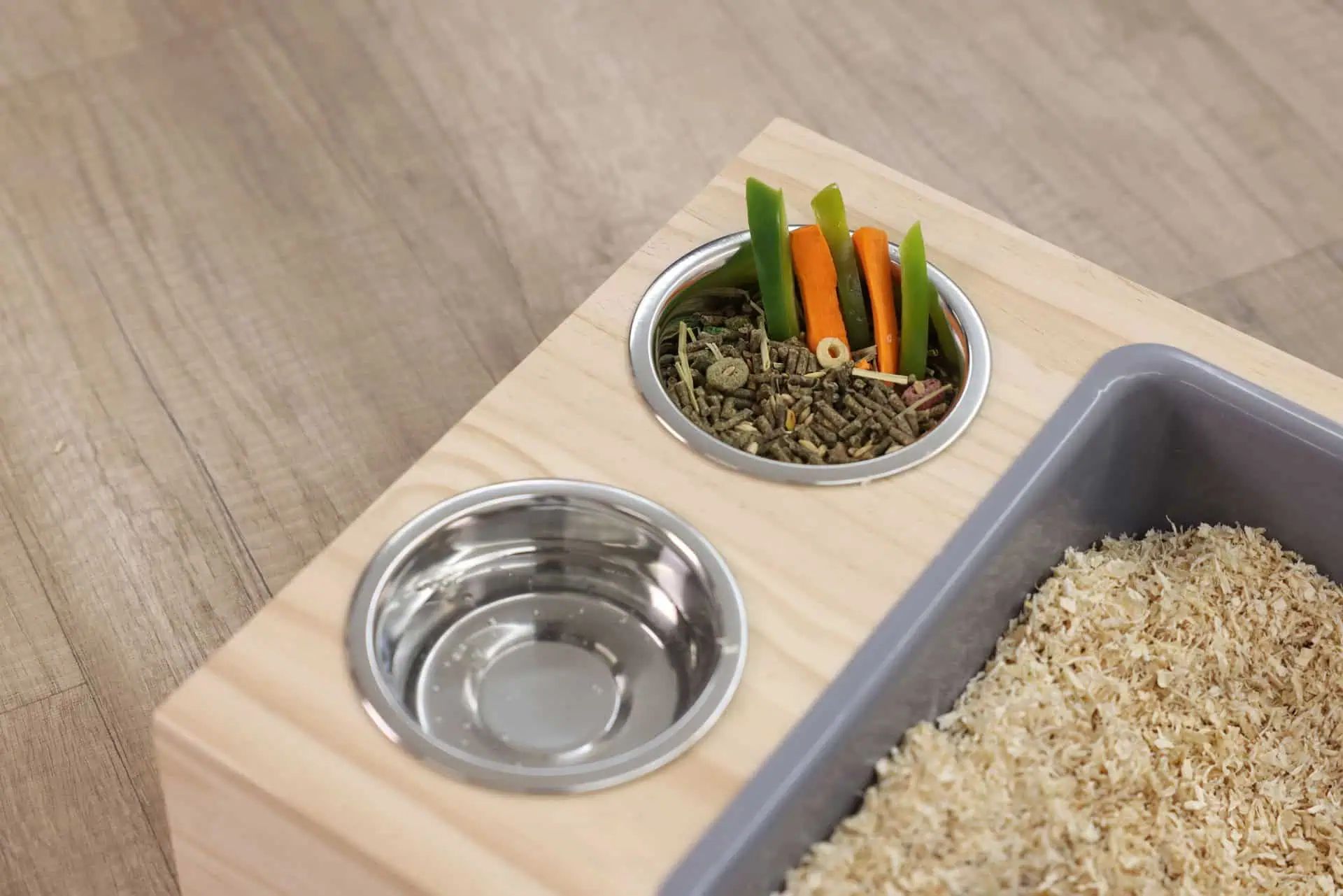 - Zwei Edelstahlnäpfe für Wasser und Trockenfutter oder Gemüse