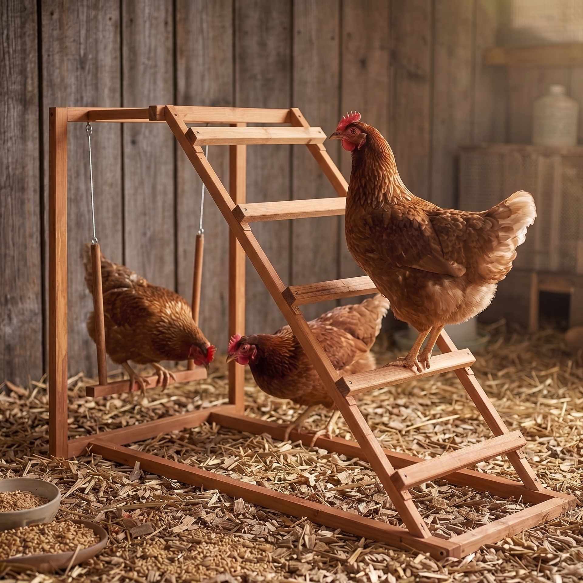 Ein Kletterturm fördert die natürliche Aktivität und das Wohlbefinden der Hühner, indem er ihnen eine abwechslungsreiche Umgebung zum Spielen und Entdecken bietet.