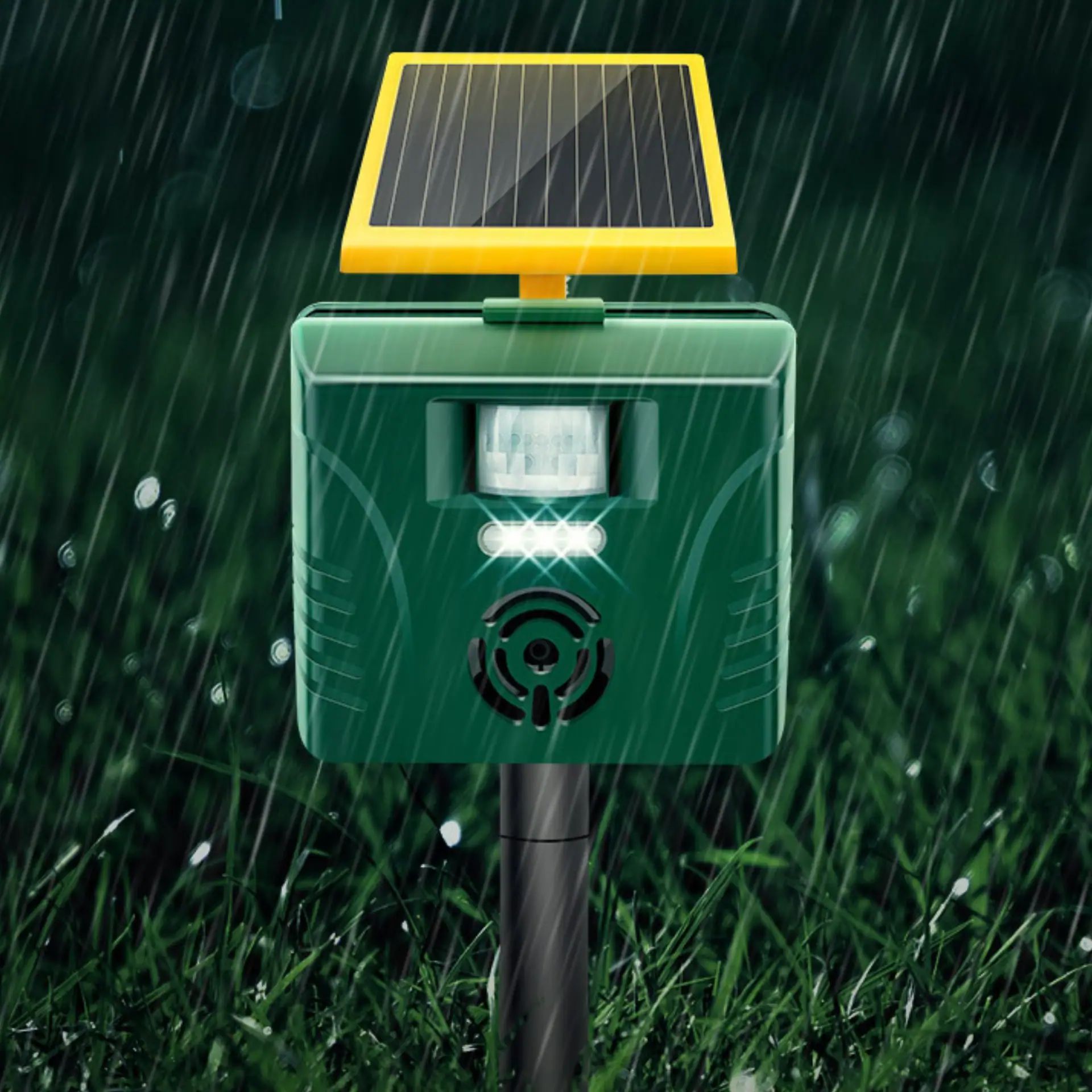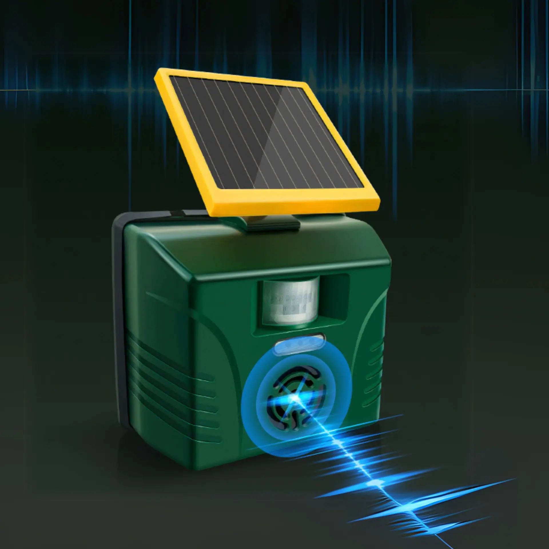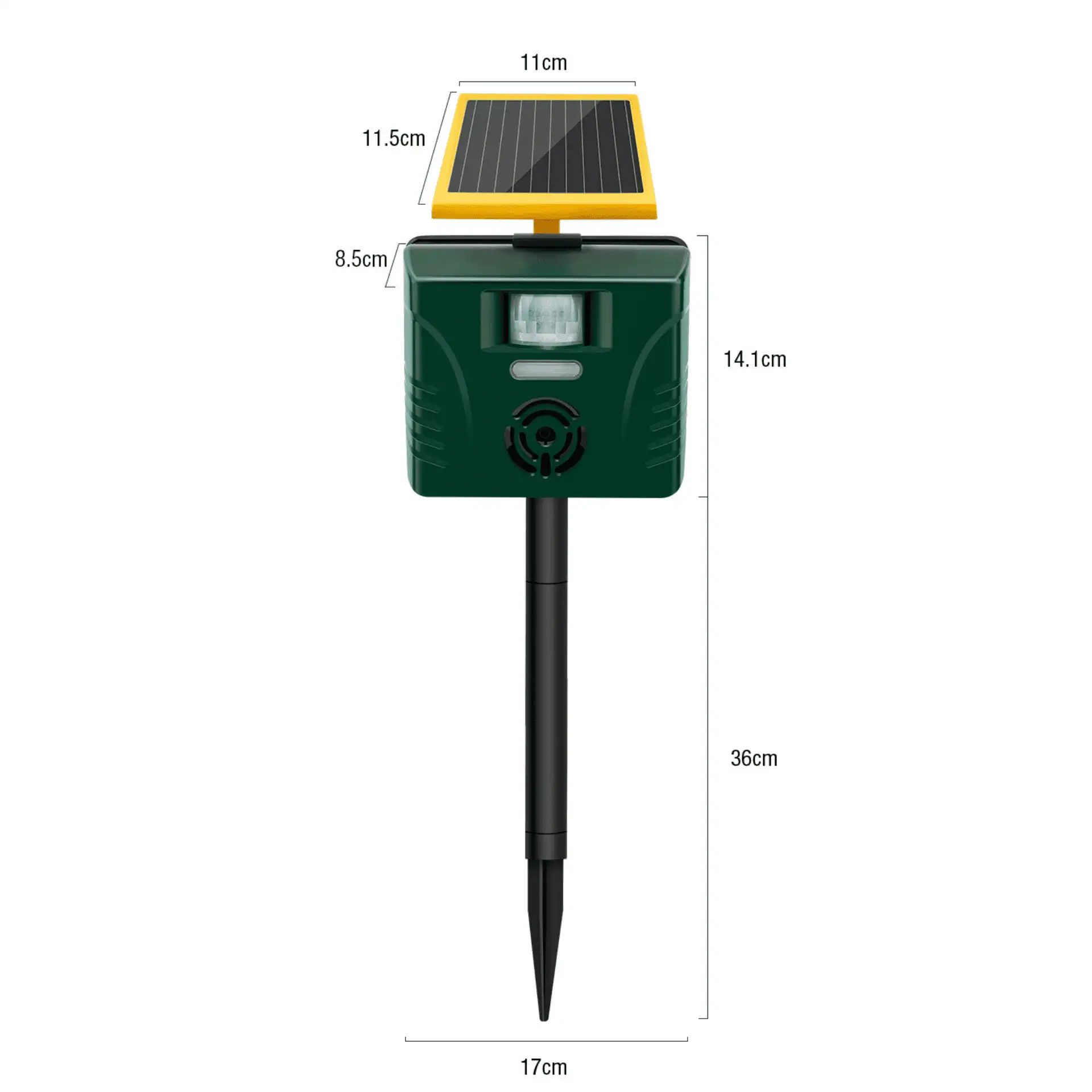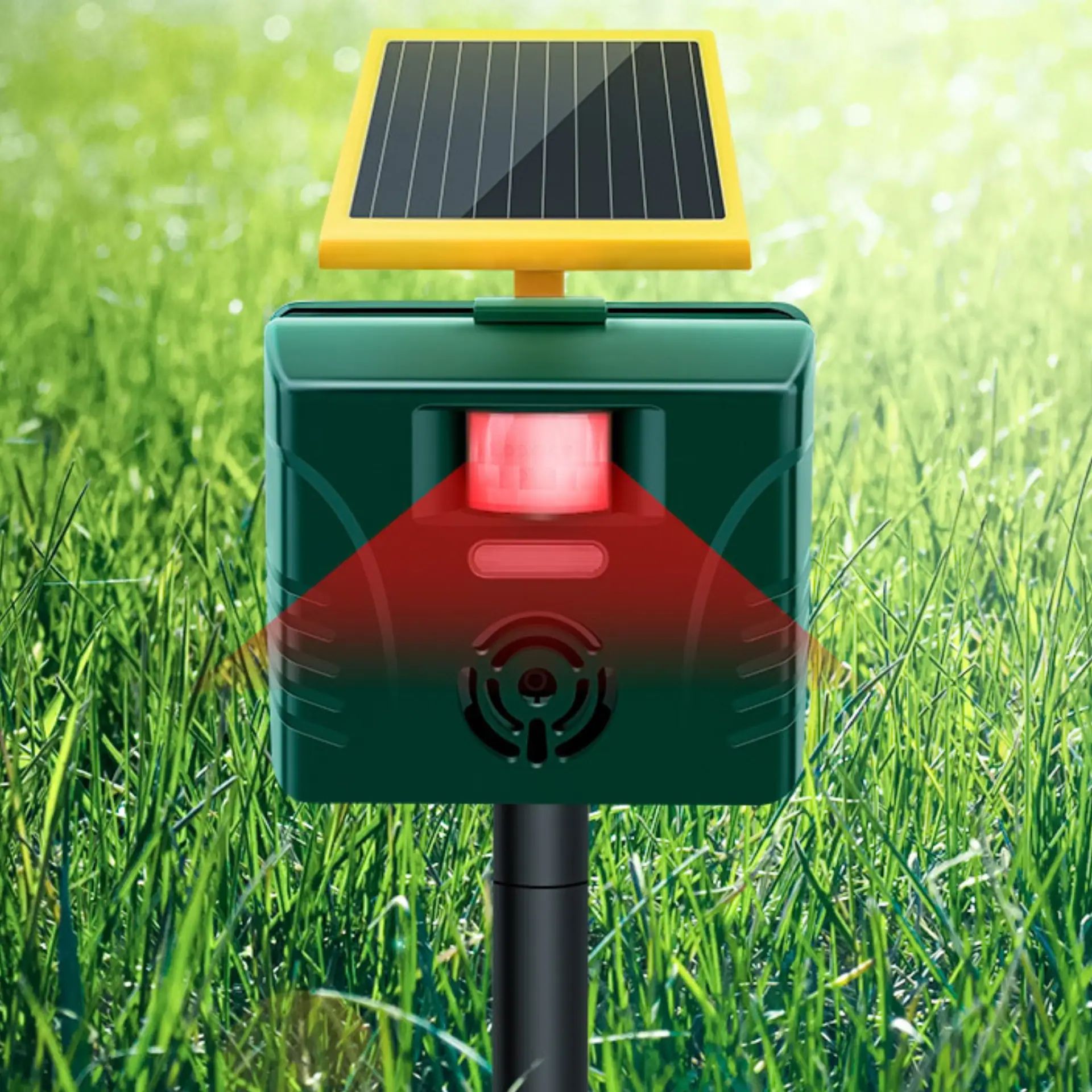 Das Gerät nutzt PIR-Detektion, um Tiere in der Nähe zu erkennen, und schreckt sie dann durch Ultraschall, laute Geräusche, starke Taschenlampenblitze und Alarme ab.