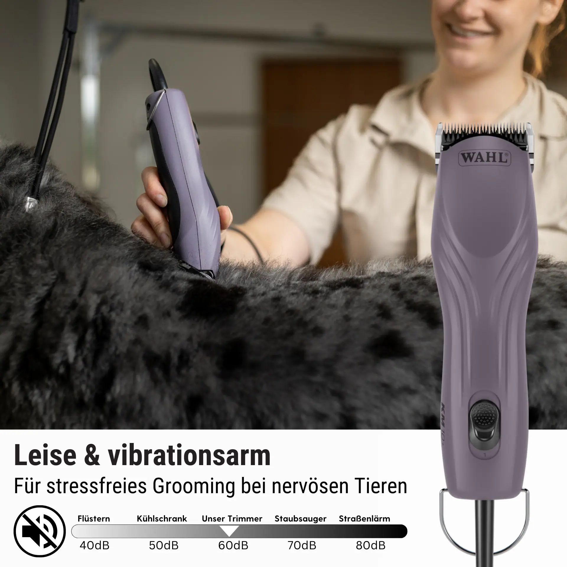 Die Wahl KM10+ arbeitet mit einem Geräuschpegel von nur 60 dB, was sie ideal für geräuschempfindliche Tiere macht und dafür sorgt, dass das Scheren nicht nur effektiv, sondern auch äußerst angenehm für deinen Hund ist.