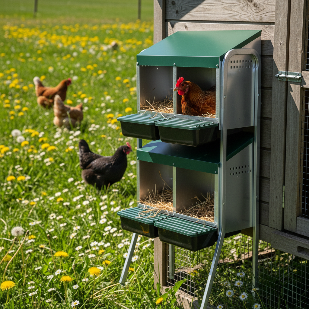 Die Verwendung von hochwertigem wetterbeständigem Metall sorgt dafür, dass das Etagen-Legenest nicht nur langlebig, sondern auch pflegeleicht ist. Damit schaffst du nicht nur einen praktischen, sondern auch einen sicheren Rückzugsort für deine Hühner. Ideal für alle, die Wert auf artgerechte Haltung legen und ihren Tieren ein angenehmes Umfeld bieten möchten.