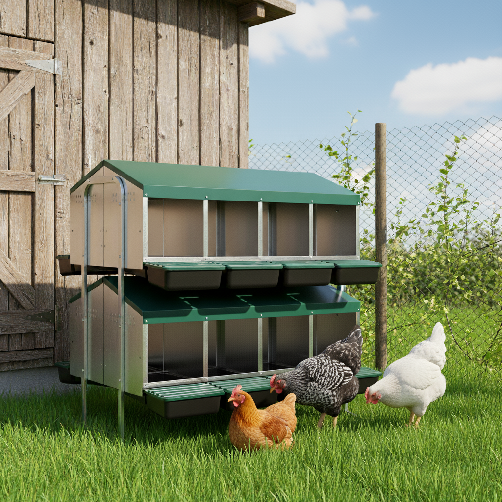 Die Verwendung von hochwertigem wetterbeständigem Metall sorgt dafür, dass das Etagen-Legenest nicht nur langlebig, sondern auch pflegeleicht ist. Damit schaffst du nicht nur einen praktischen, sondern auch einen sicheren Rückzugsort für deine Hühner. Ideal für alle, die Wert auf artgerechte Haltung legen und ihren Tieren ein angenehmes Umfeld bieten möchten.