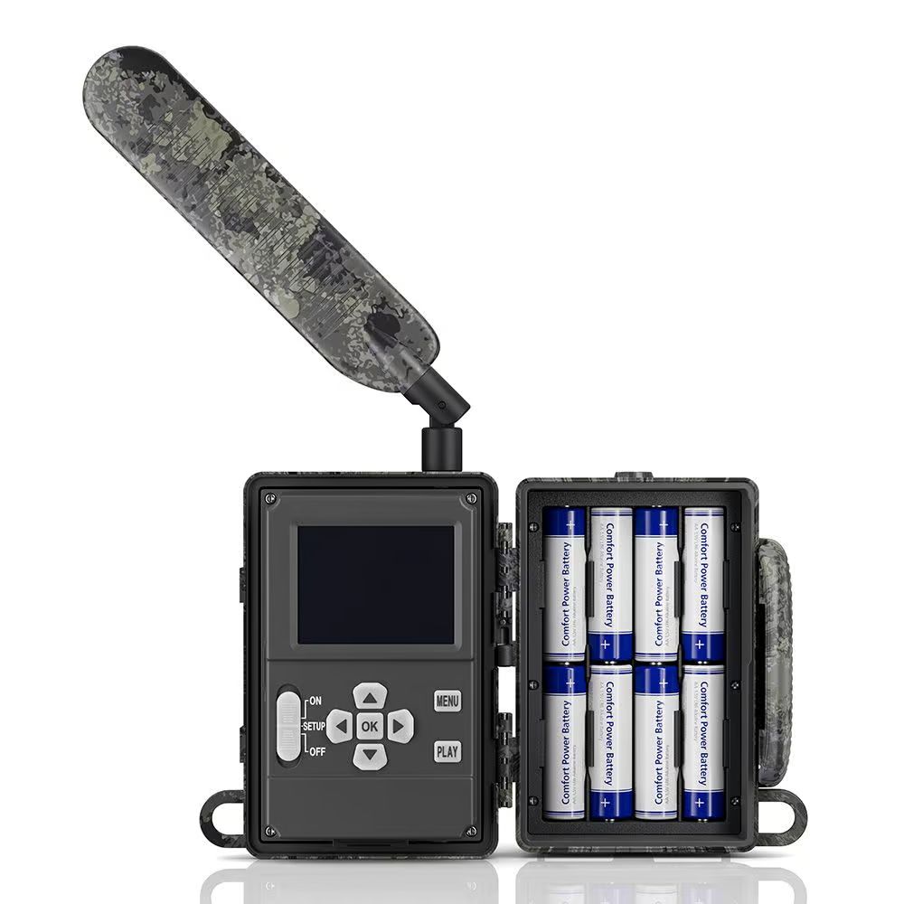 Die Kamera benötigt 4 AA-Batterien, die je nach Nutzung mehrere Monate halten können.