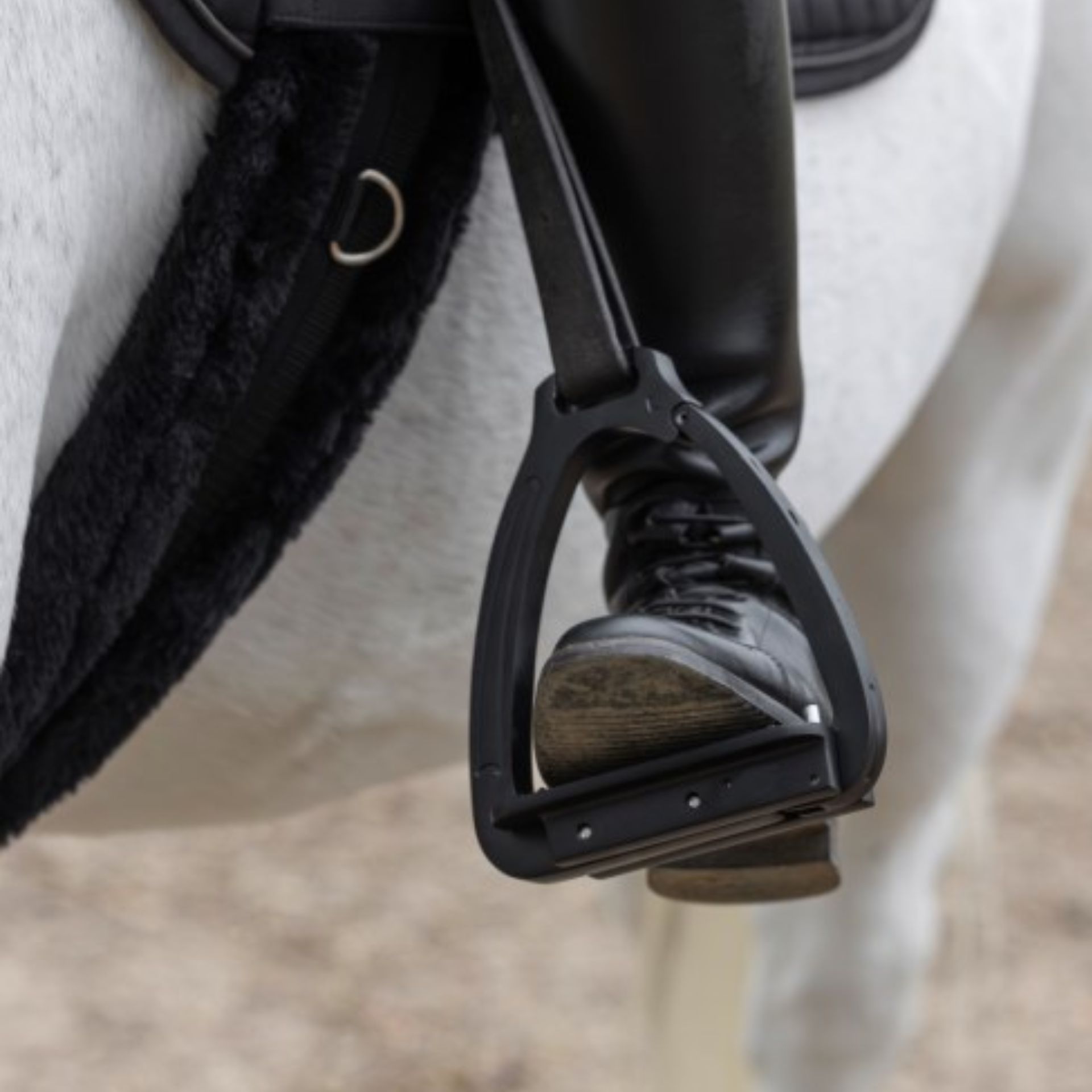 - mit klappbarem Seitenbügel, der schnell in Situationen, wie z. B. einem Sturz, den Fuß des Reiters freigibt