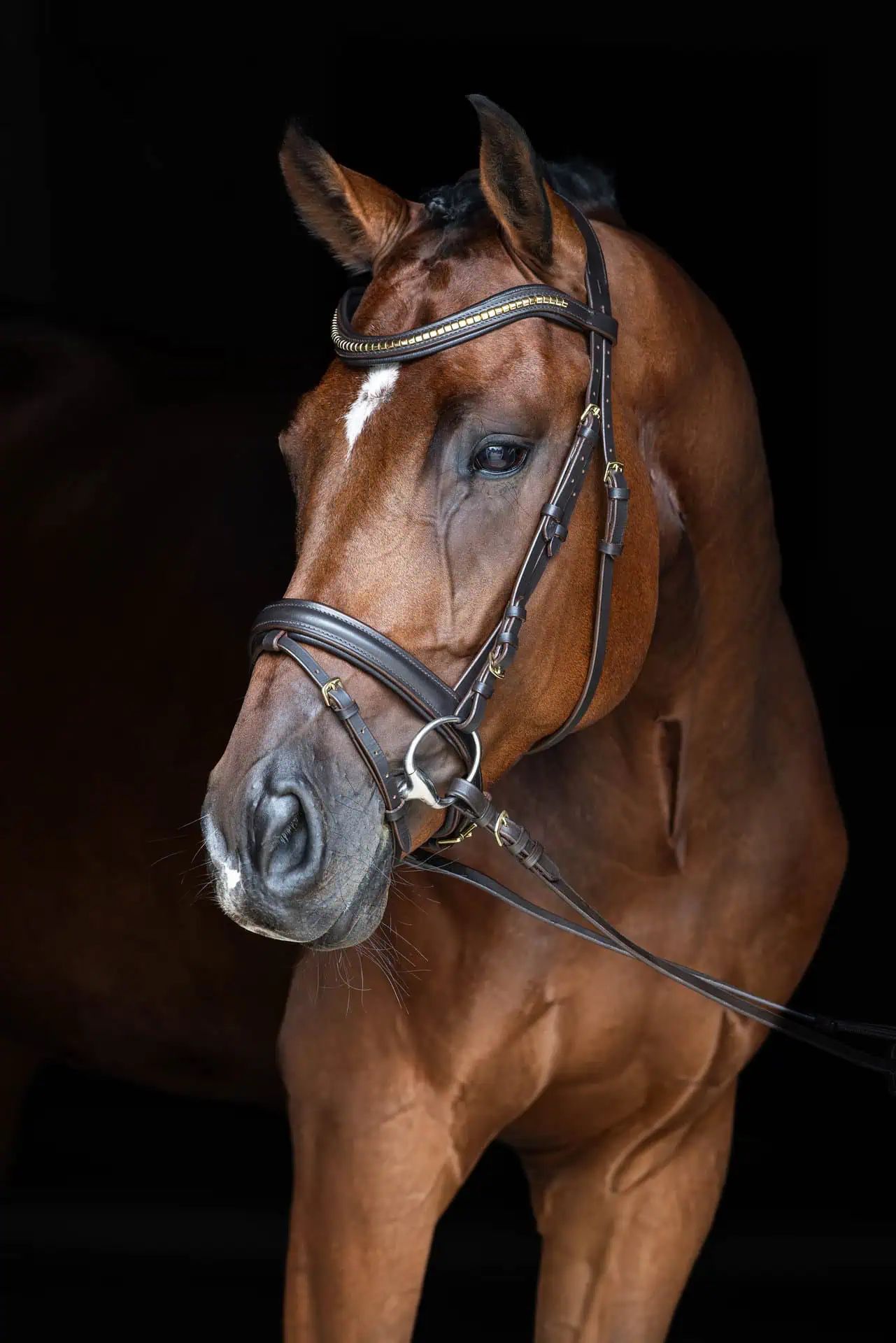 Der geschwungene Stirnriemen mit Clinchern sorgt für einen sicheren und eleganten Sitz. Die hochwertigen, rostfreien Beschläge garantieren Langlebigkeit und Widerstandsfähigkeit. Der Zaum ist aus feinstem Leder gefertigt und überzeugt durch seine hochwertige Verarbeitung.