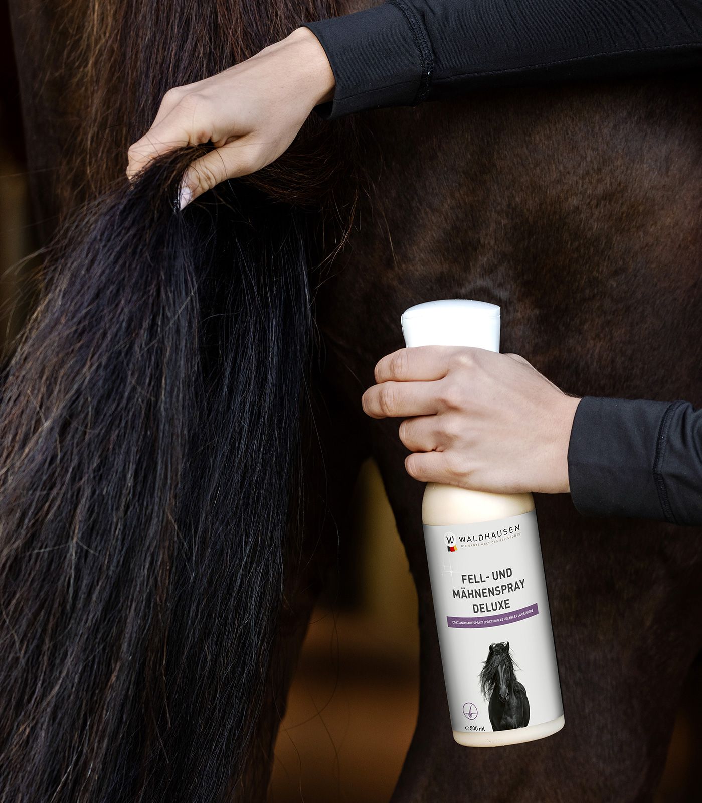 Mit dem Waldhausen Fell- und Mähnenspray Premium erleichterst du dir die tägliche Fellpflege und schenkst deinem Pferd einen strahlenden Auftritt!