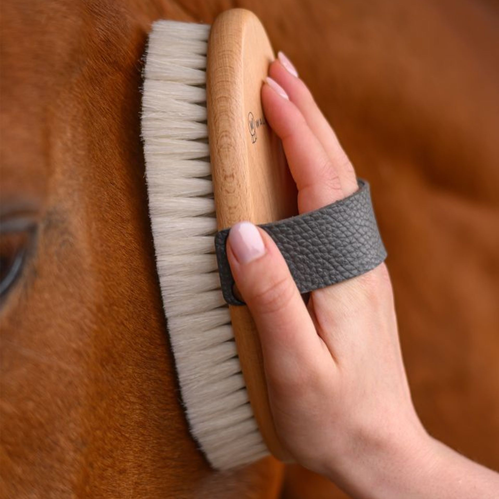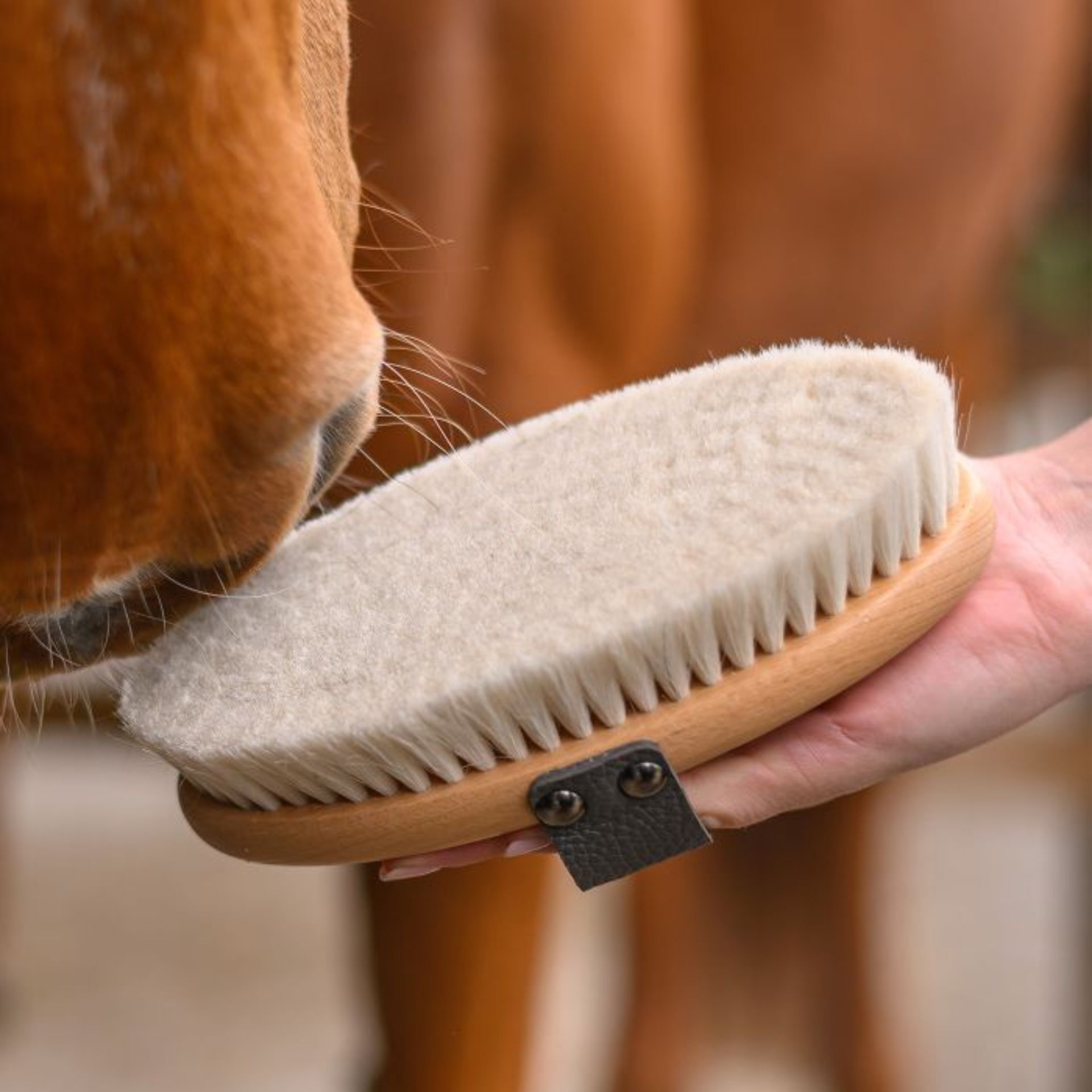 Das weiche und glatte Bürstenhaar ist besonders sanft zur Haut deines Pferdes und hinterlässt garantiert kein Staubkorn. Die Kardätsche liegt angenehm in der Hand und ermöglicht dir ein präzises Arbeiten.