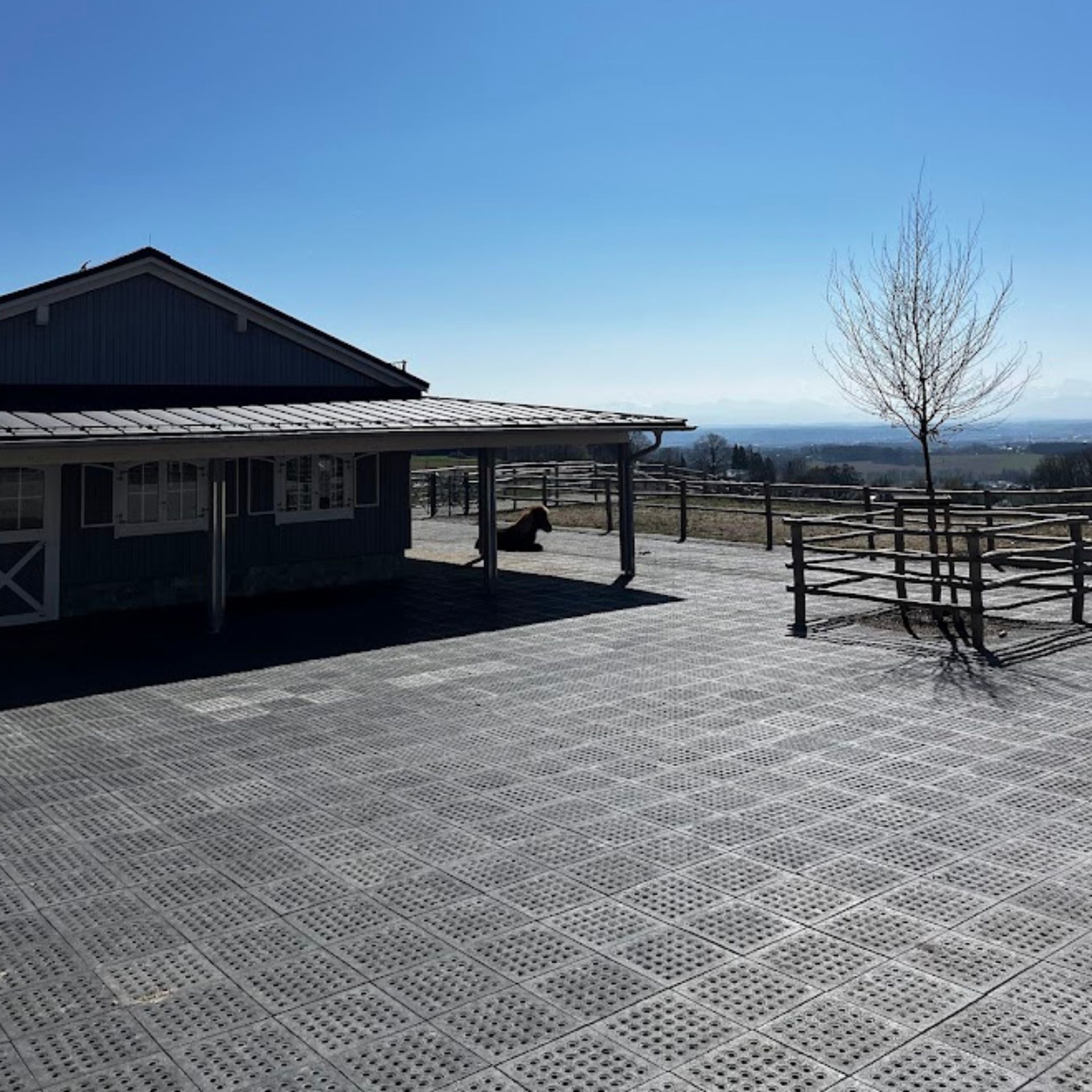 Mit unseren robusten Reitplatz- und Paddockplatten aus recyceltem PVC schaffst du im Handumdrehen einen stabilen und belastbaren Untergrund für deinen Reitplatz oder Paddock. Diese Platten lassen sich einfach und schnell verlegen, ohne dass ein komplizierter Unterbau nötig ist, dank des durchdachten Designs.