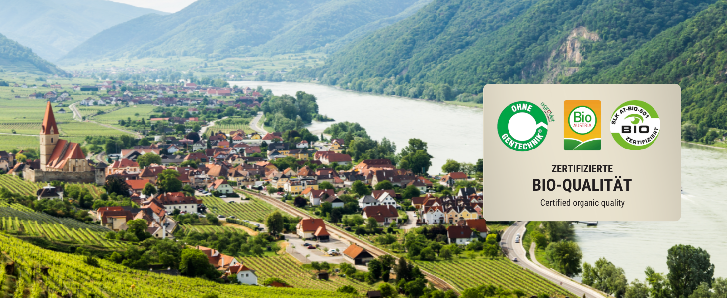 Unser gentechnikfreies Futter stammt ausschließlich aus biologischem Anbau und ist AMA-Gütesiegel tauglich. Das steht für höchste Qualität und Herkunftstransparenz.