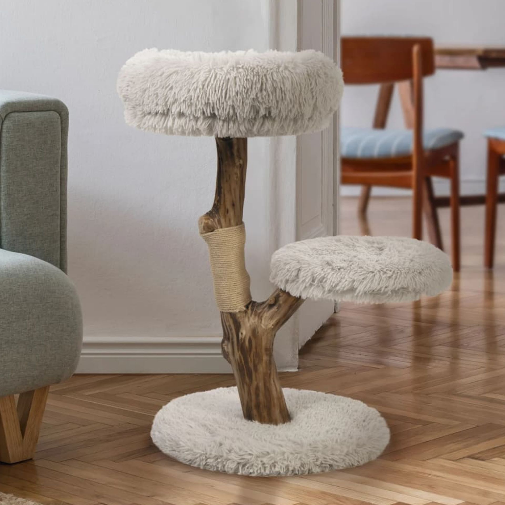 Durch die stabile Holzkonstruktion und die rutschfesten Kappen steht der Kratzbaum sicher, auch bei lebhaften Katzen.