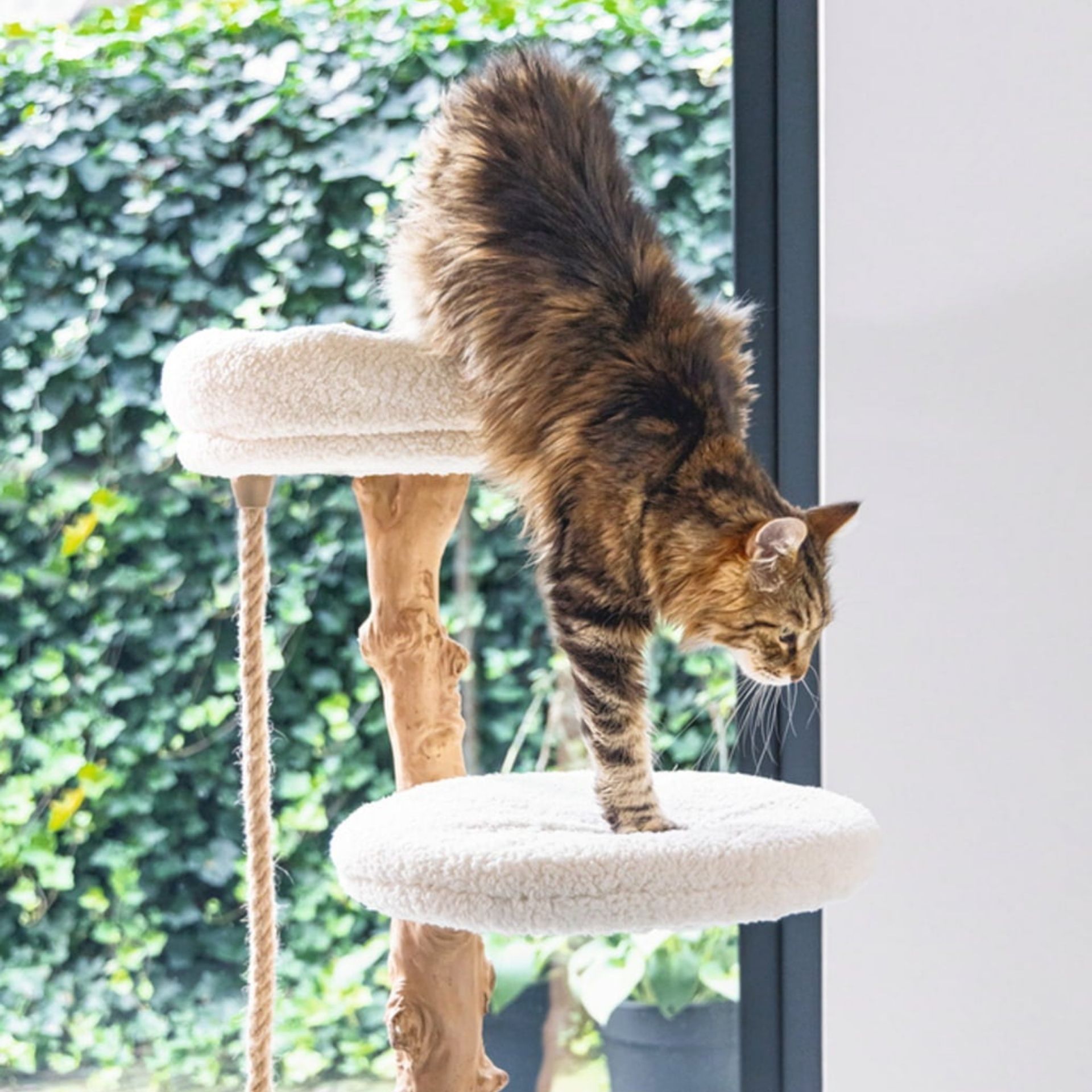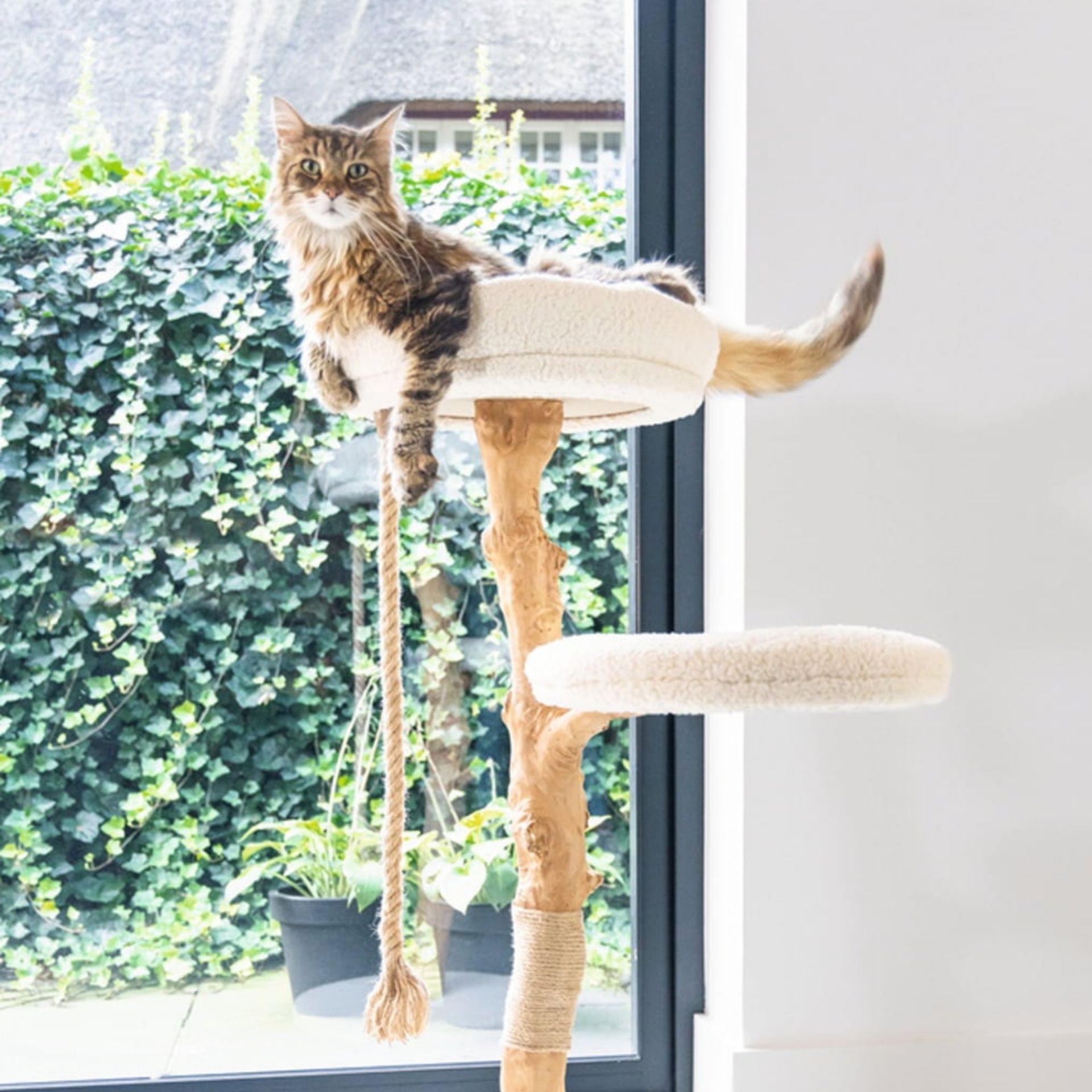 Der Designed by Lotte Holz-Kratzbaum Vilja kombiniert naturbelassenes Birnen- und Dattelbaumholz mit weichem, weißem Plüsch und schafft damit einen eleganten Ruhe- und Spielplatz für deine Katze. Mit einer Plüschplattform, einem Körbchen, einer Kratzstelle mit Juteseil und einem integrierten Spielseil bietet er alles, was das Katzenherz begehrt.