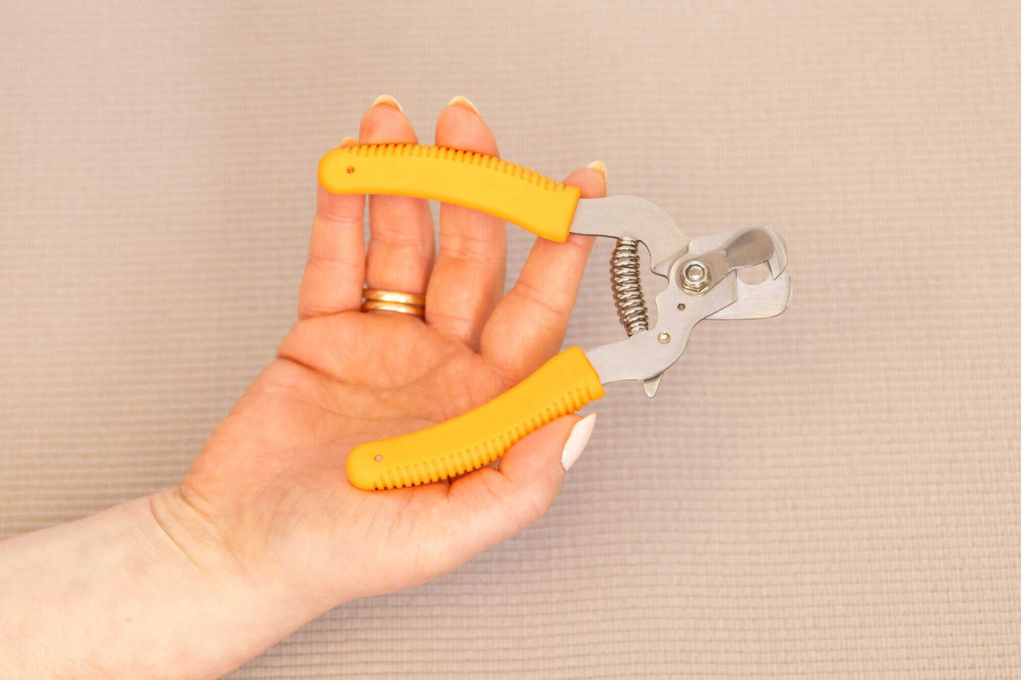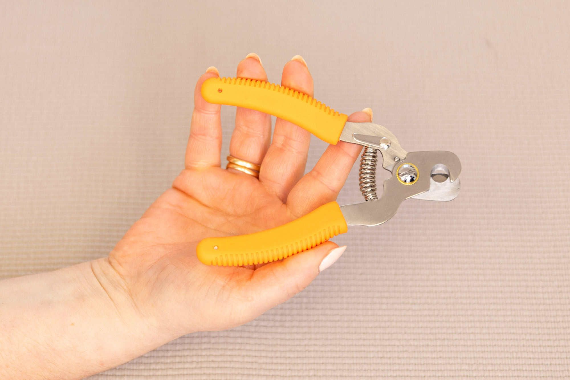 Die Schere verfügt über eine Metallplatte hinter den Klingen, die verhindert, dass zu viel der Kralle auf einmal abgeschnitten wird, was das Risiko verringert, den empfindlichen Bereich zu treffen.