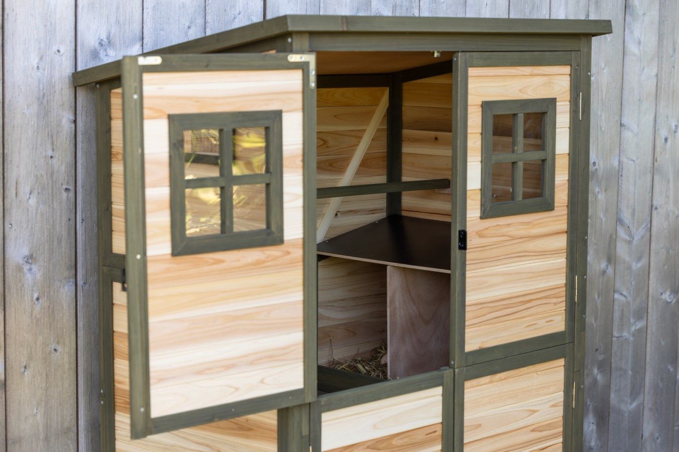 Der Stall besteht aus wertigem Holz, welches mit einer umweltfreundlichen Lasur auf Wasserbasis vorbehandelt wurde.