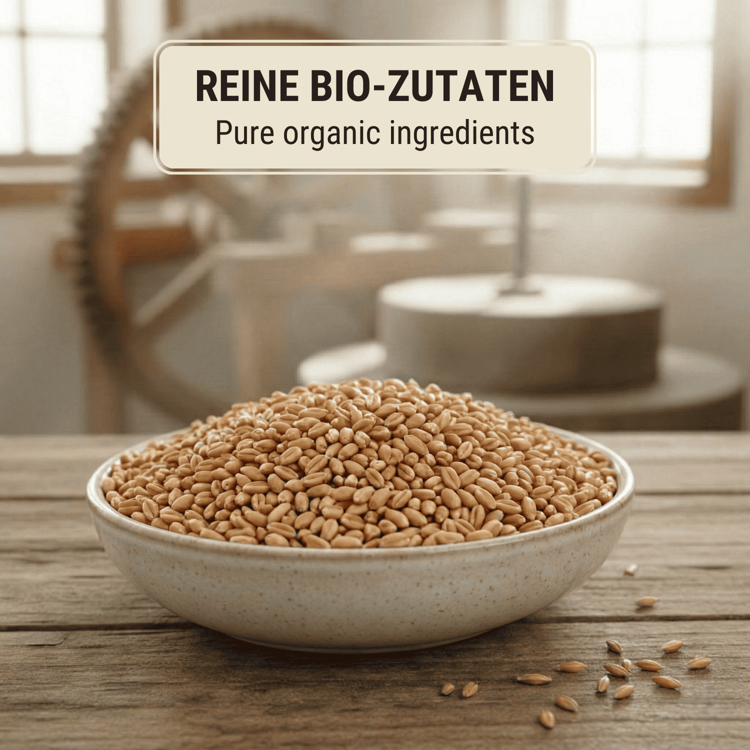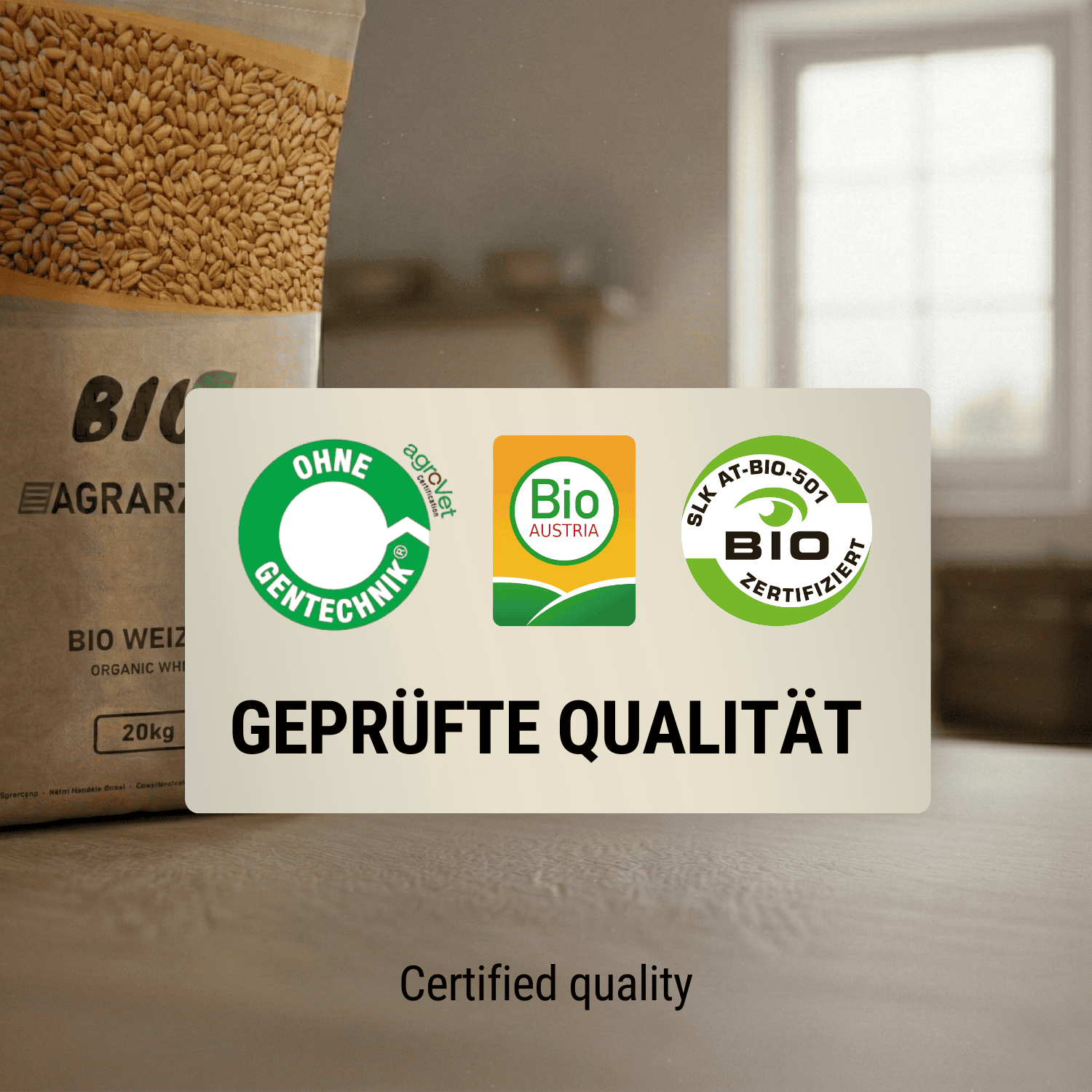 Die Qualität unseres Getreides beginnt direkt auf dem Feld, denn wir beziehen unseren Weizen zu 100 % von zertifizierten Bio-Landwirten aus der Region. Durch die Einhaltung der strengen Bio-Austria-Richtlinien garantieren wir dir ein Futter, das vollständig ohne Gentechnik und Pestizide auskommt und durch kurze Transportwege maximale Frische bewahrt.