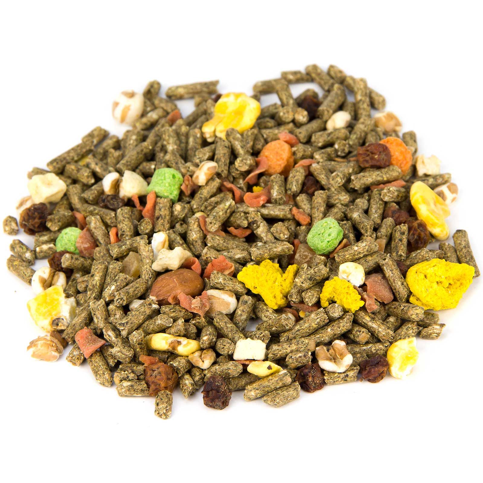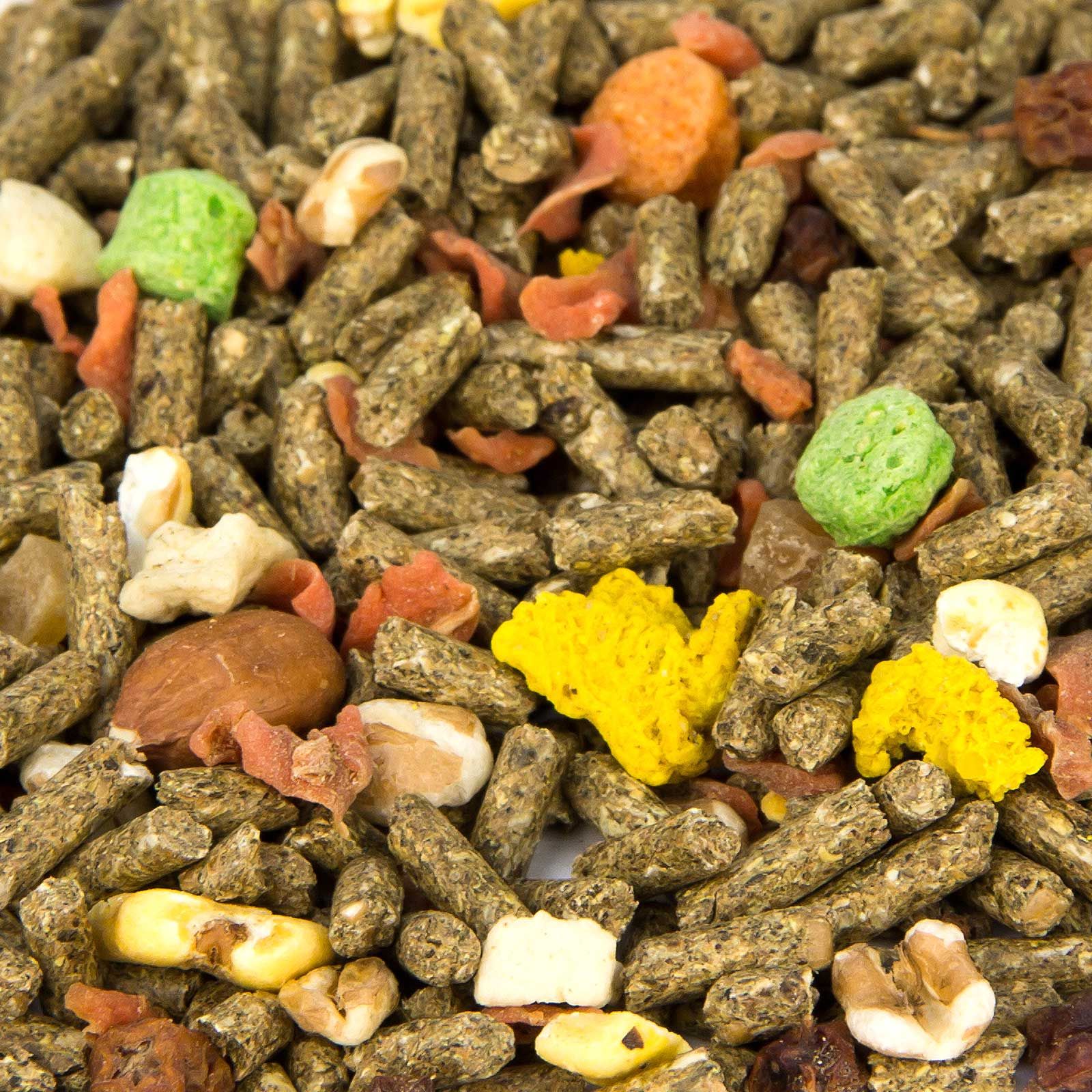 Luzernegrünmehl, Weizenkleie, Gerste, Weizen, Mais, Soja(bohnen)extraktionsschrotfutter mit Soapstock (dampferhitzt), Lignocellulose, Rapsextraktionsschrotfutter mit Stock, Alfalfaheu, Karottenw ürfel, Mais gepoppt, Weizen gepoppt, Calciumcarbonat, Zuckerrübenmelasse, Maiskroketten grün, Maiskroketten rot, Maiskroketten gelb, Monocalciumphosphat, Bananenchips, Erdnüsse "Red Skin", Hagebutten, Ebereschenbeeren, Magnesiumoxid, Natriumchlorid
