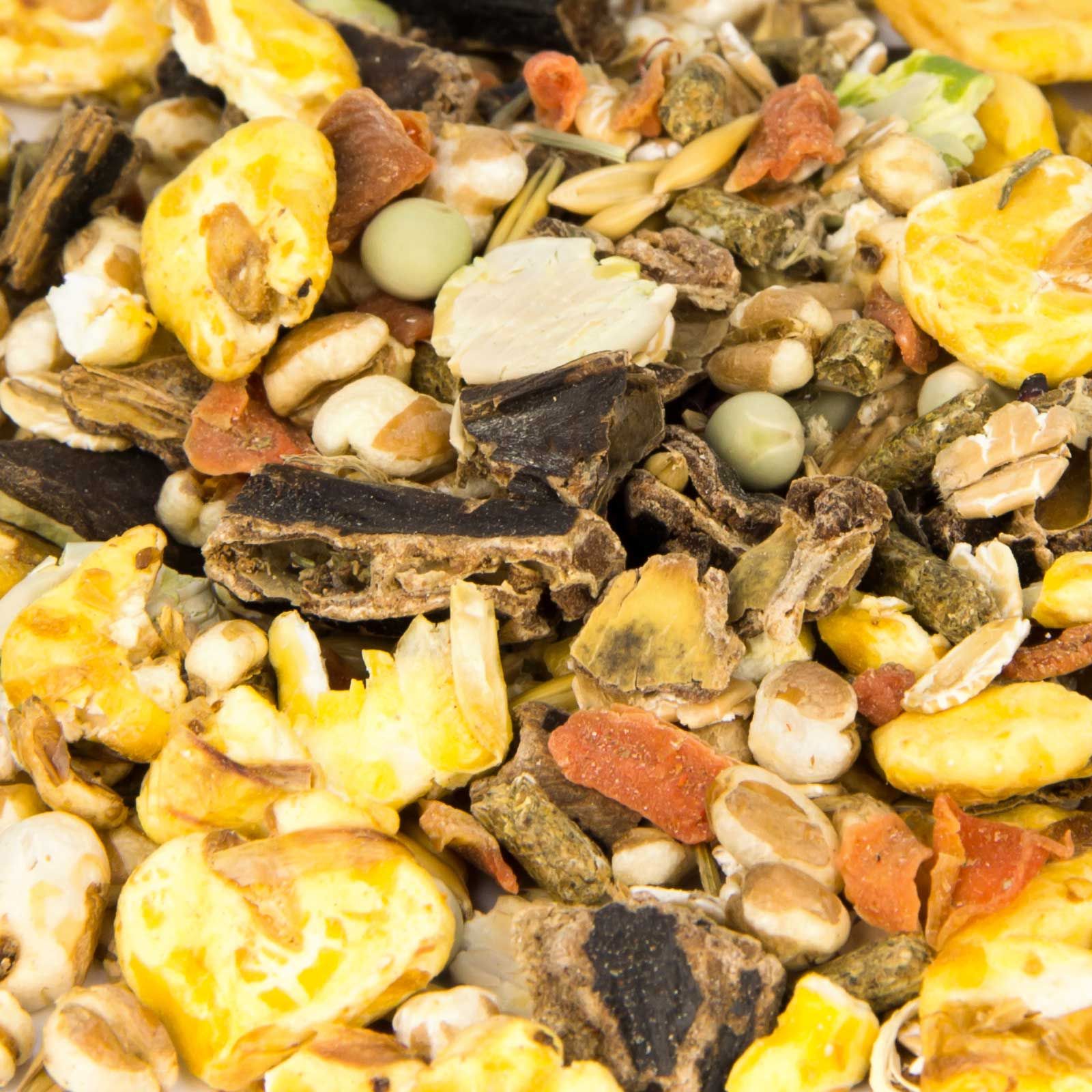 Johannisbrot geschnitten , Mais gepoppt, Erbsen grün klein, Kleinmais, Weizen gepoppt, Hafer, Karottenwürfel, Erbsenflocken, Weizenflocken, Haferflocken, Weizenkleie grob, Grünmehl, Weizen, Maiskraftfutter, Apfeltrester, Anissamen, Trockenschnitzel, Eibischwurzel, Süßholzwurzel, Tymian, Huflattichblätter, Schafgarbenkraut, Brombeerblätter, Rapsextraktionsschrotfutter mit Stock, Kürbiskernkuchen, Hibuskus geschnitten, Melasse, Lignocellulose, Calciumcarbonat, Monocalciumphosphat, Natriumchlorid, Natriumbicarbonat, Magnesiumoxid