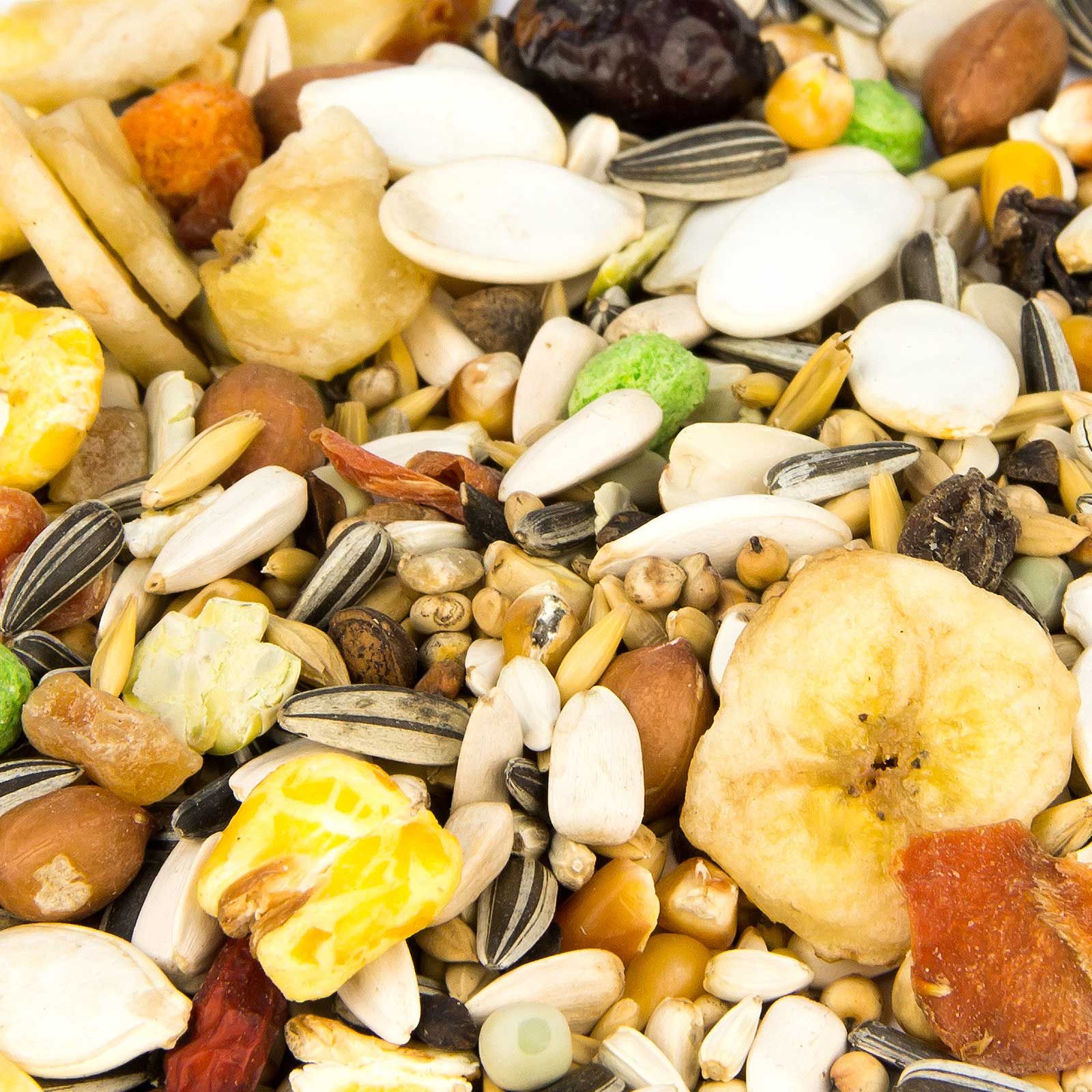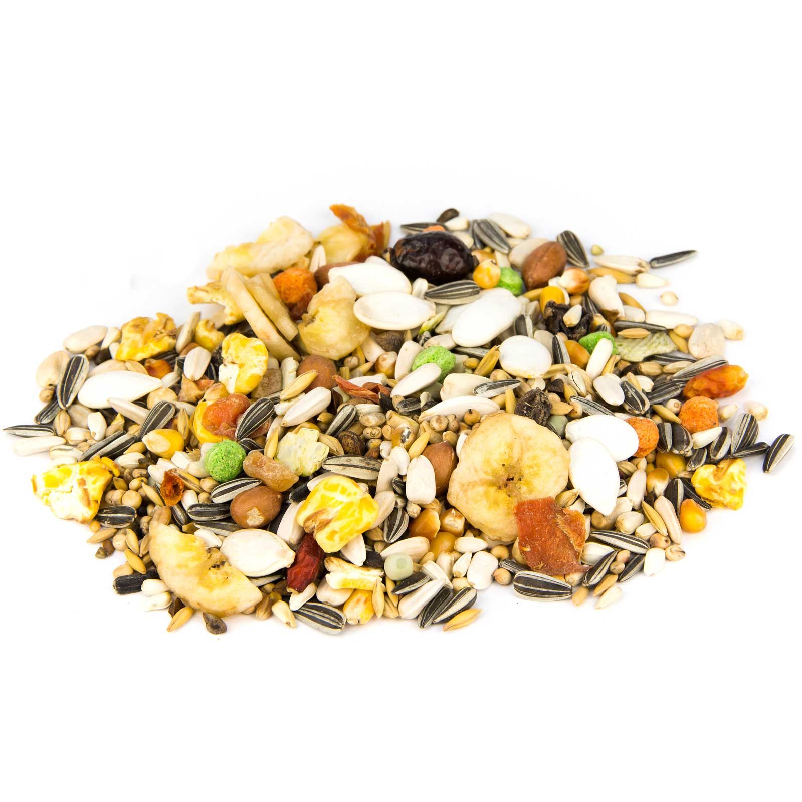 12 % Dari, 3 % Weizen, 4 % Braugerste, 5 % Hafer, 5 % Rollhafer, 11 % Mittelmais, 2 % Mais gepoppt, 2 % Erbsenflocken, 3 % Erdnüsse "Red Skin", 1 % Zirbelnüsse klein, 10 % Kardisaat, 3 % Kürbiskerne weiß, 13 % Sonnenblumen gestreift, 6 % Sonnenblumenkerne weiß, 2 % Erbsen klein, 3 % Buchweizen, 3 % Paddyreis, 2 % Hagebutten, 2 % Rosinen, 2 % Karottenflocken, 1 % Trockenfrüchte, 1 % Pfefferoni, 2 % Maiskroketten rot + grün, 2 % Bananenchips