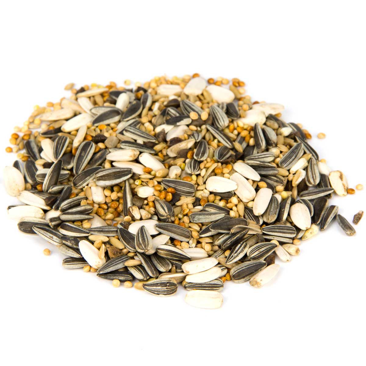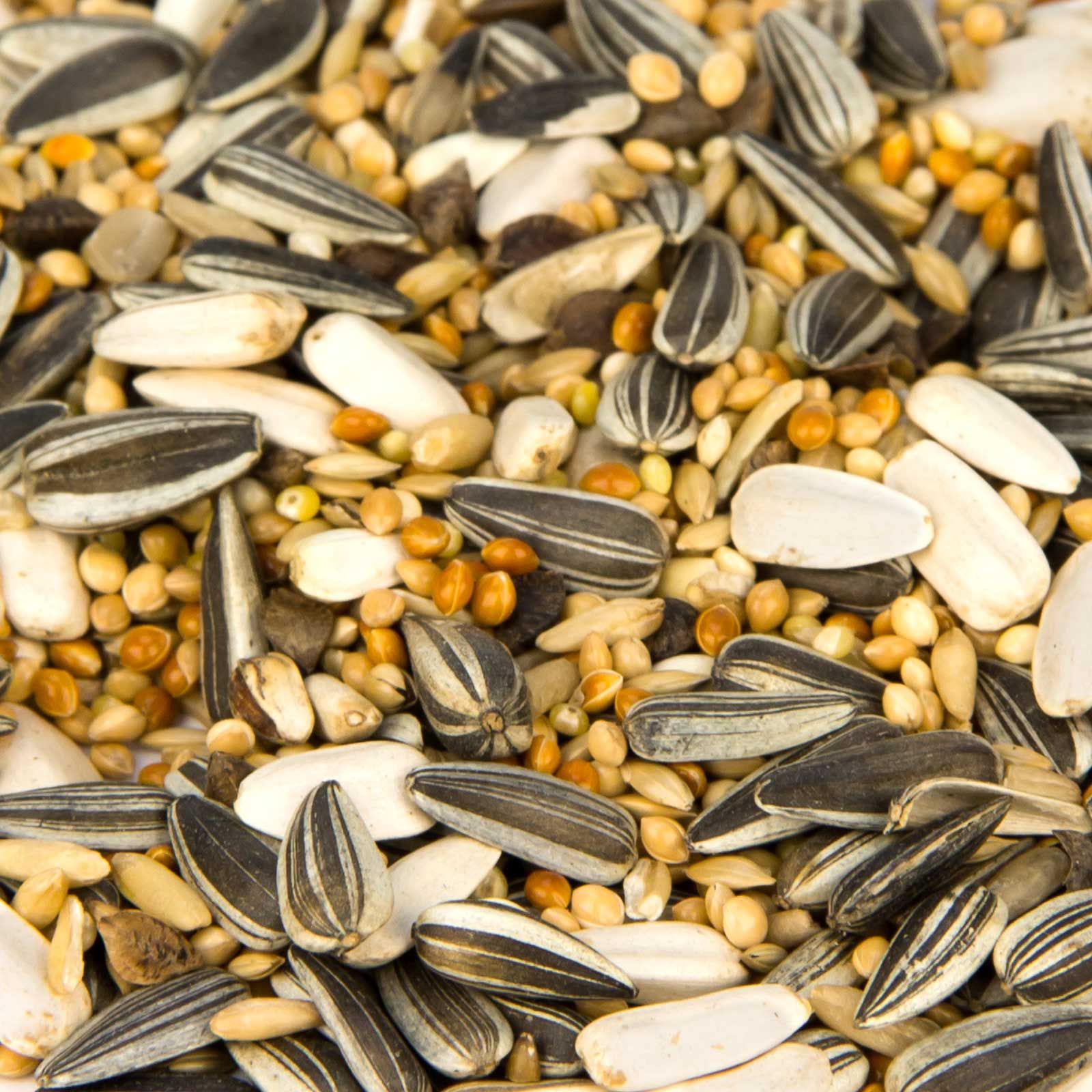 31 % Gelbhirse, 27 % Sonnenblumen gestreift, 5 % Sonnenblumen weiß, 10 % Rothirse, 10 % Glanzsamen, 10 % Rollhafer, 4 % Buchweizen, 3 % Kardisaat